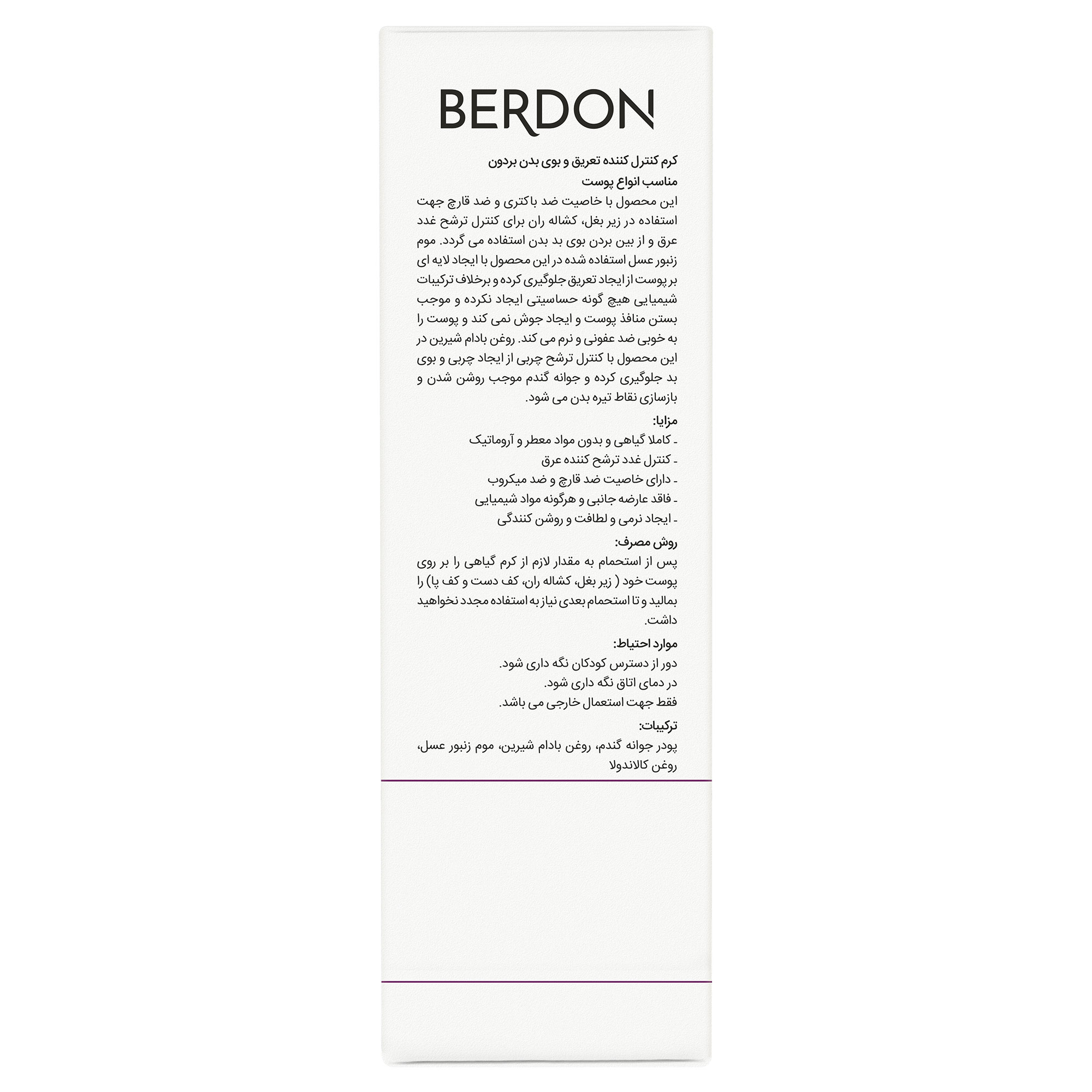 این محصول با خاصیت ضد باکتری و ضد قارچ جهت استفاده در زیر بغل کشاله ران برای کنترل ترشح غدد عرق و از بین بردن بوی بد بدن استفاده می گردد. موم زنبور عسل استفاده شده در این محصول با ایجاد لایه ای بر پوست از ایجاد تعریق جلوگیری کرده و برخلاف ترکیبات شیمیایی هیچ گونه حساسیتی ایجاد نکرده و موجب